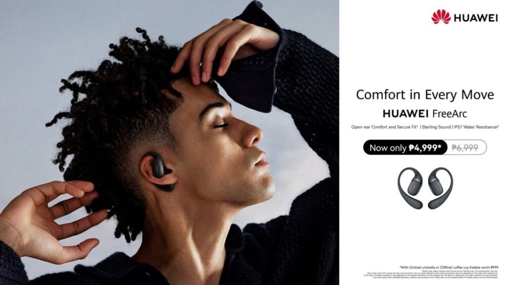 Feel comfortable while you move through your summer plans and enjoy clear, sterling sound with the HUAWEI FreeArc. Get your hands on the HUAWEI FreeArc, available for PHP 4,999 on Shopee, Lazada, TikTok, HUAWEI Online Stores and enjoy a free umbrella worth PHP 999, and get a free coffee cup worth PHP 999 when you purchase at any HUAWEI Experience Stores nationwide.