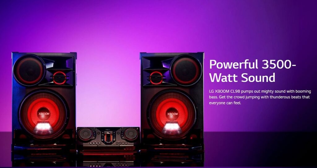 You can keep the party going all day (or all night) with the LG XBoom CL98, which offers a powerful 3500-watt sound. It has the ability to pump out strong sound with booming bass. Each drop of the bass is sure to have the crowd jumping. The LG XBoom CL98 doesn’t miss a beat even with aesthetics. Flashing colored lights and X-Flash Pro sync with the music to add excitement and atmosphere to parties.