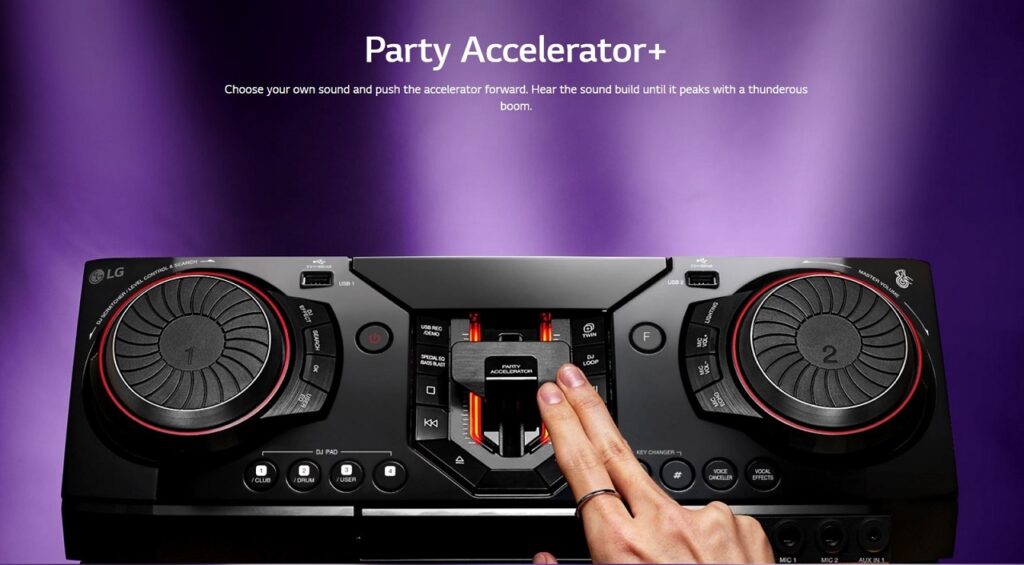 Fancy yourself as a DJ? Control the music and have fun using a variety of DJ sound effects straight from your smartphone. The LG XBoom CL98 also comes with a Party Accelerator+ function. You can choose your own sound and push the accelerator forward to hear the sound build until it peaks with a thunderous boom.