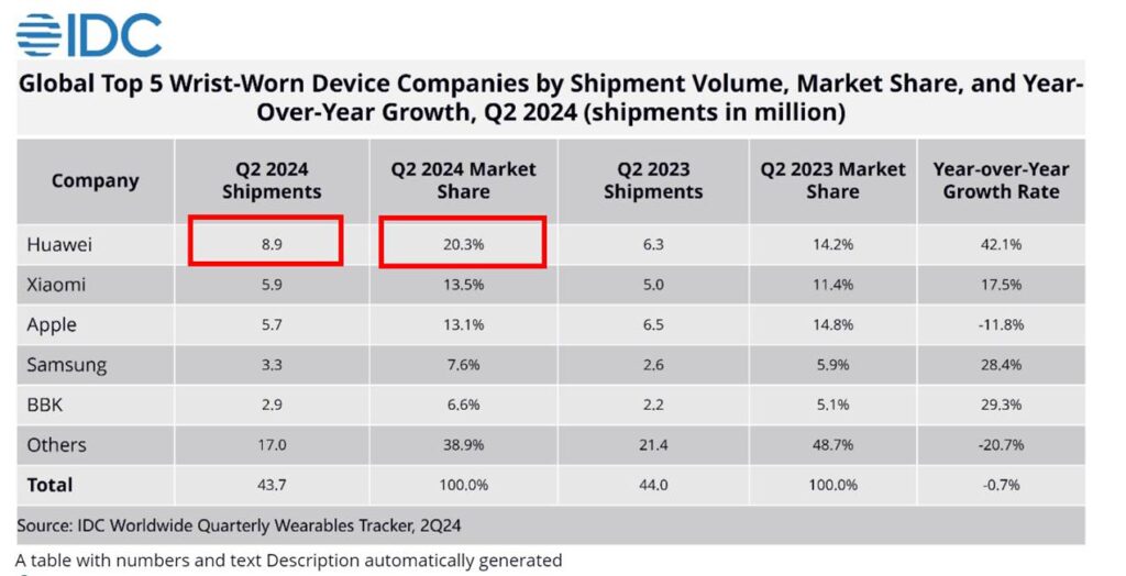 HUAWEI’s outstanding performance in the wearable space is highlighted by its substantial shipments and market share, posting 8.9 million units in shipments and 20.3% market share in Q2 of 2024, compared to 6.3 million units shipments and 14.2% market share in Q2 of 2023. The global tech brand has recorded a 42.1% YoY growth rate, besting its competitors.