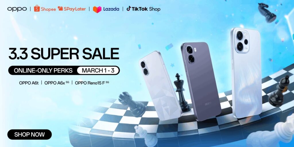OPPO’s 3.3 Sale is your chance to grab exclusive online deals, all-day vouchers, free gifts, and a smartwatch raffle. Don’t miss out and shop from March 1 to 6 on Shopee, Lazada, TikTok Shop, and OPPO’s official online store.