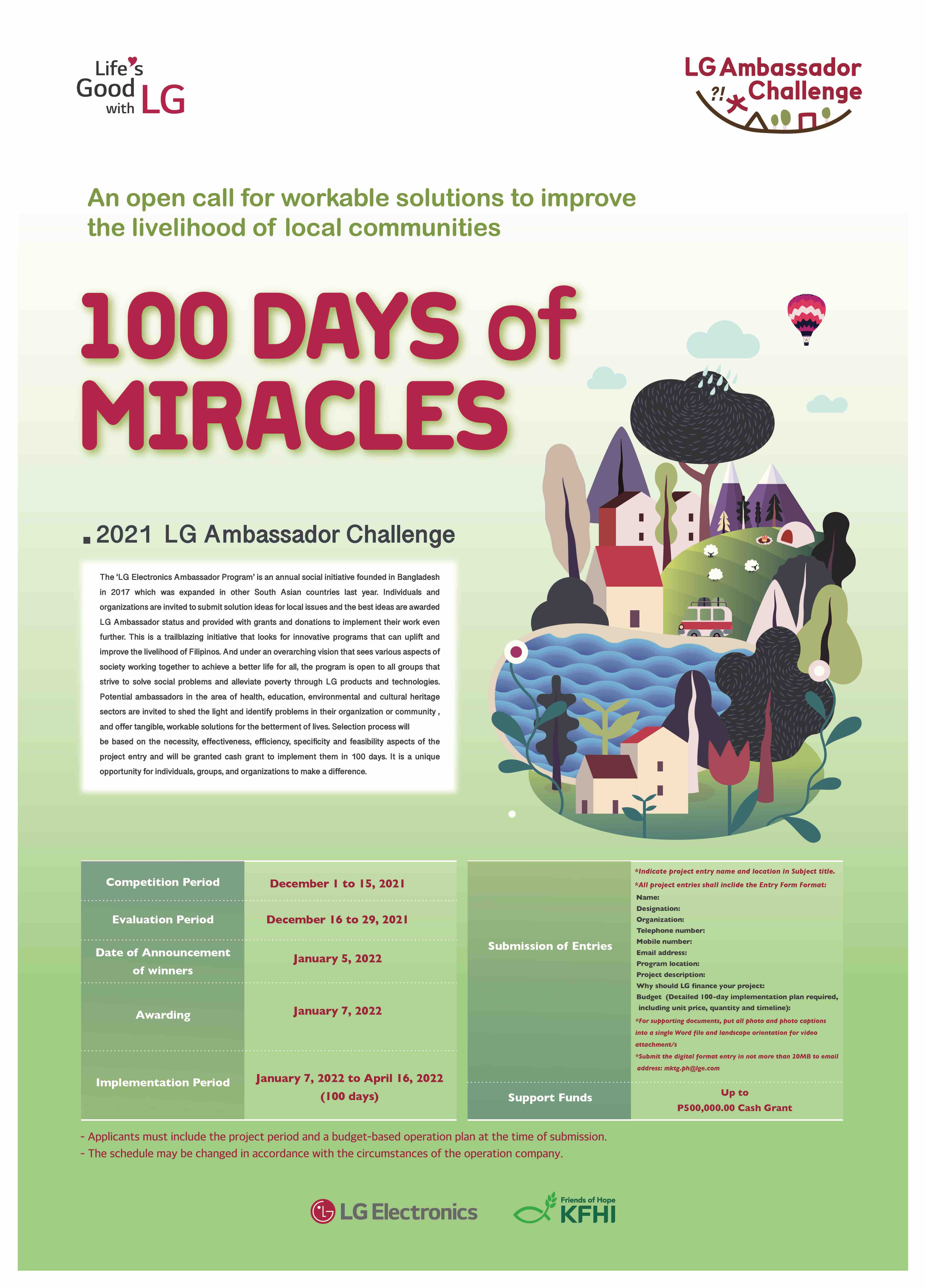 Globally renowned electronics giant LG, announces call for entries to the Philippines’ LG Ambassador Challenge. The program, initiated globally with Korea Friends of Hope International, is a first in the Philippines and a part of LG’s commitment to help the Filipinos through social contribution activities that deliver sustainable growth to local communities.