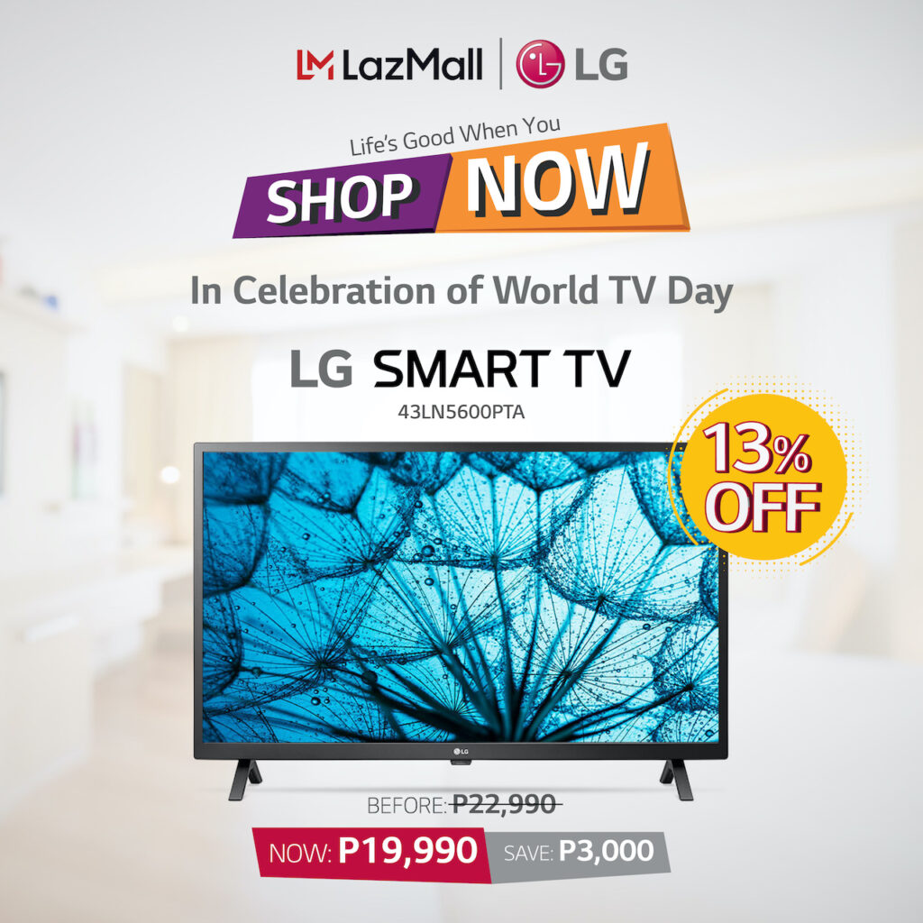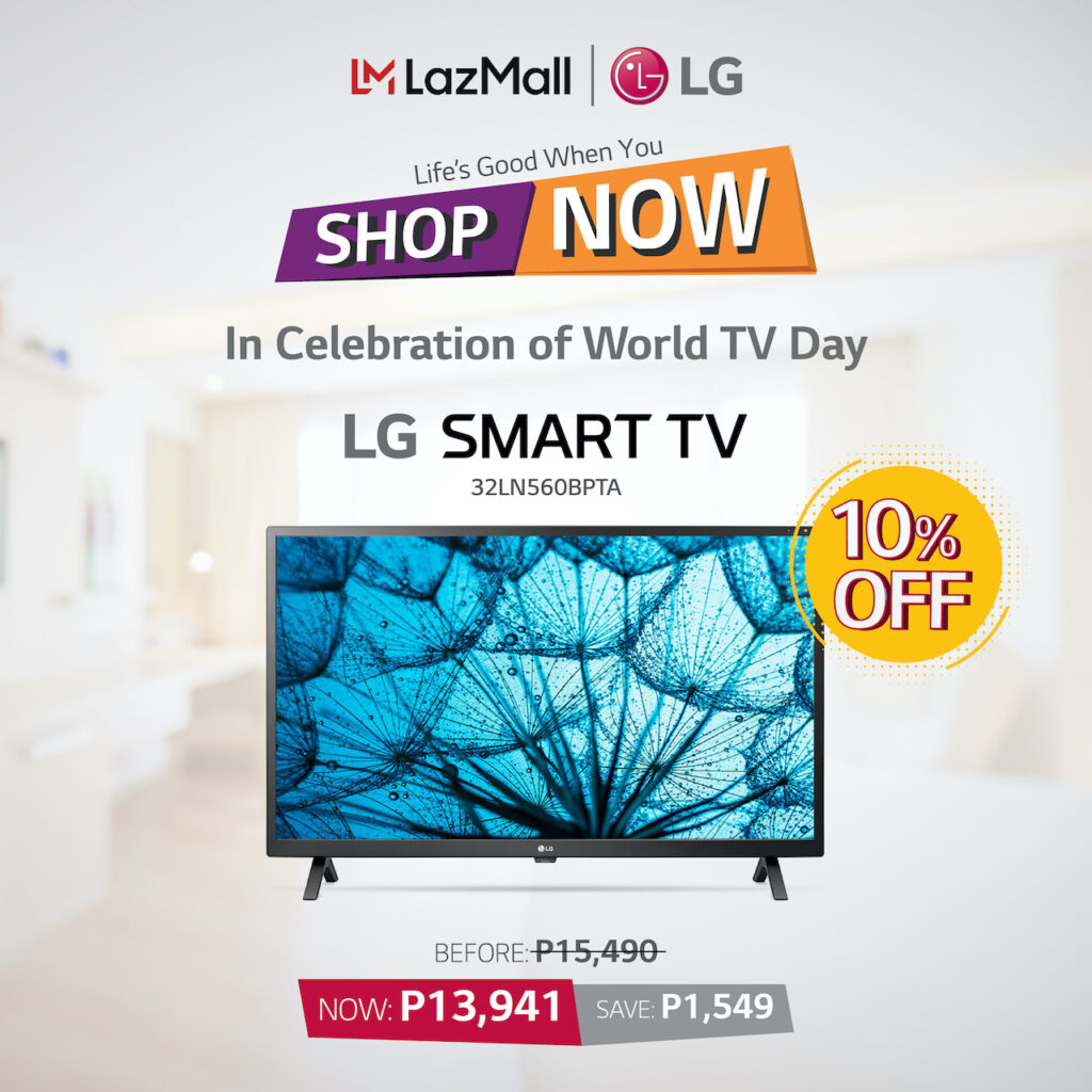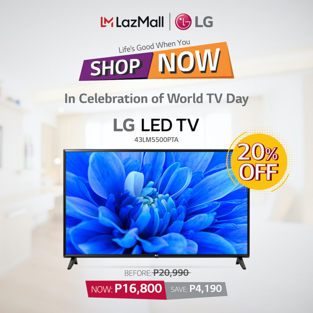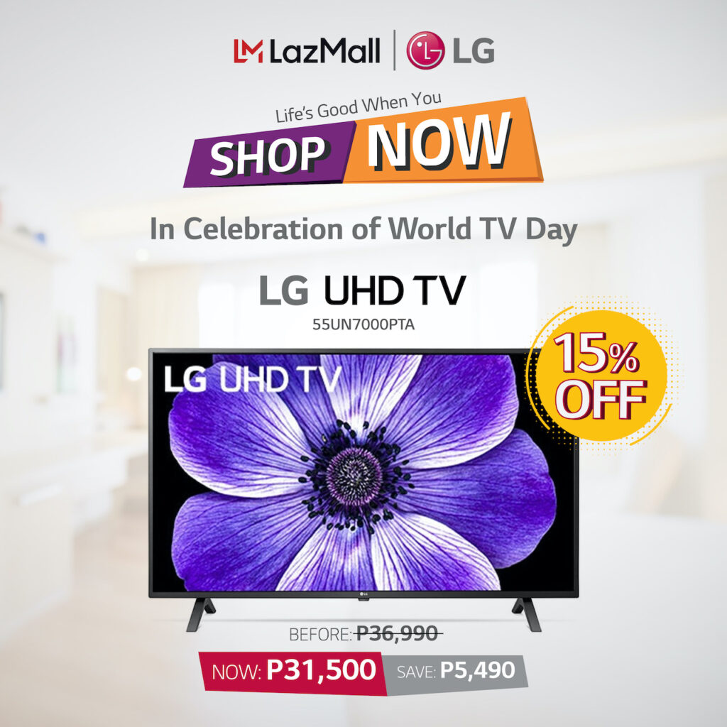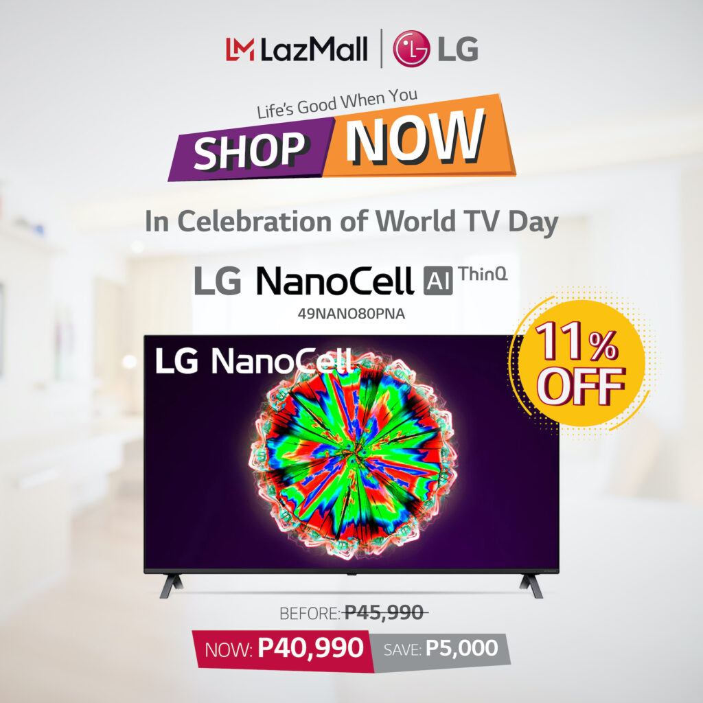In celebration of World TV Day, LG will be offering a special promo price for some of its TV models in Lazada. Purchases of LG 43LM5500PTA will enjoy 20% discount bringing the price down to P16,800. The LG UHD 55UN7000PTA will get a 15% reduction to 31,500, the LG NanoCell TV 49Nano80PNA will be just P40,990 after an 11% discount, while FHD Smart TVs, the 32LN560BPTA and 43LN5600PTA, will get a 10% and 13% discount respectively. The 32” will be 13,941 while the 43” Smart TV will go down to P19,990.