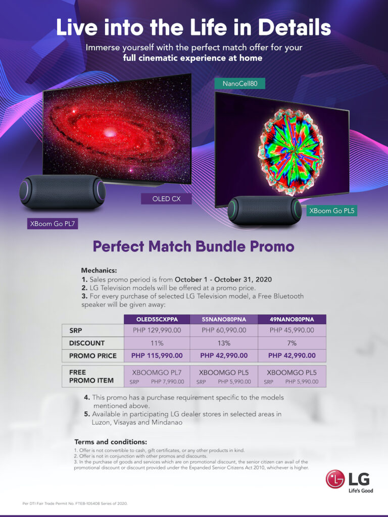 As a special introductory offer for both TVs, will be offering the Perfect Match Bundle Promo for the whole month of October. LG OLED 55” TV, LG’s Nano 55”, and Nano 49” will get a sizable discount from its original price. Not only that, each purchase of an LG NanoCell 80 will receive a free LG XBoom PL5 while each purchase of an LG OLED CX will get a complimentary LG XBoom PL7. This special promotion will run from October 1-31, and will be available in selected LG retail partners nationwide.