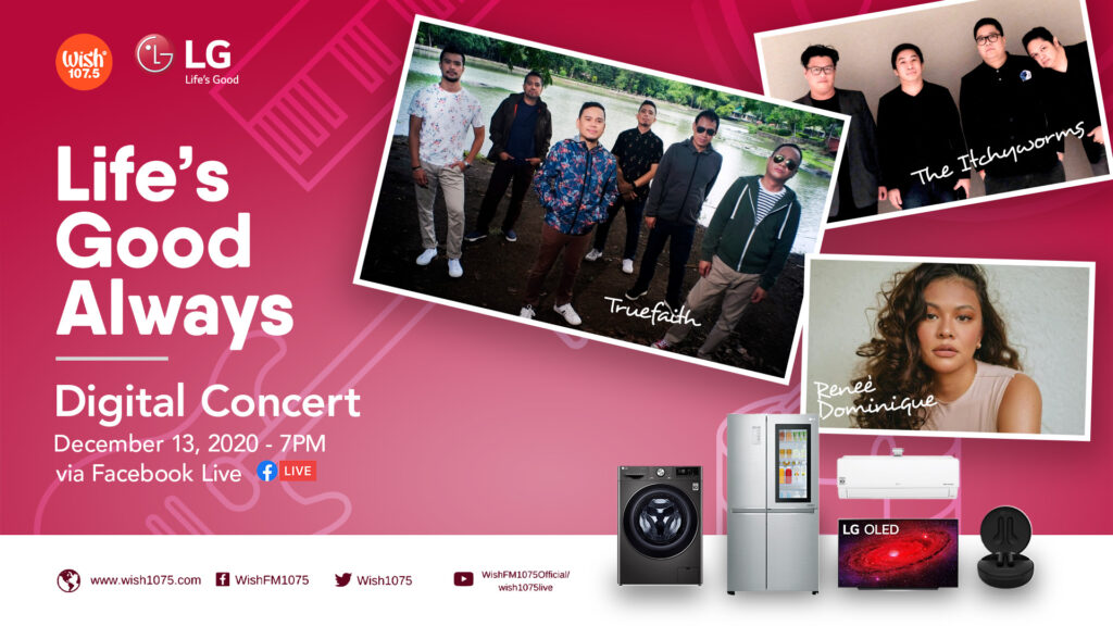 As an added treat to LG’s loyal customers, everyone is invited to catch LG ‘Life’s Good Always Digital Concert’ live on Sunday, December 13, 7PM via Wish 107.5’s Facebook Page. See performances from The Itchyworms, True Faith, and Renee Dominique and get a chance to win exciting giveaways!