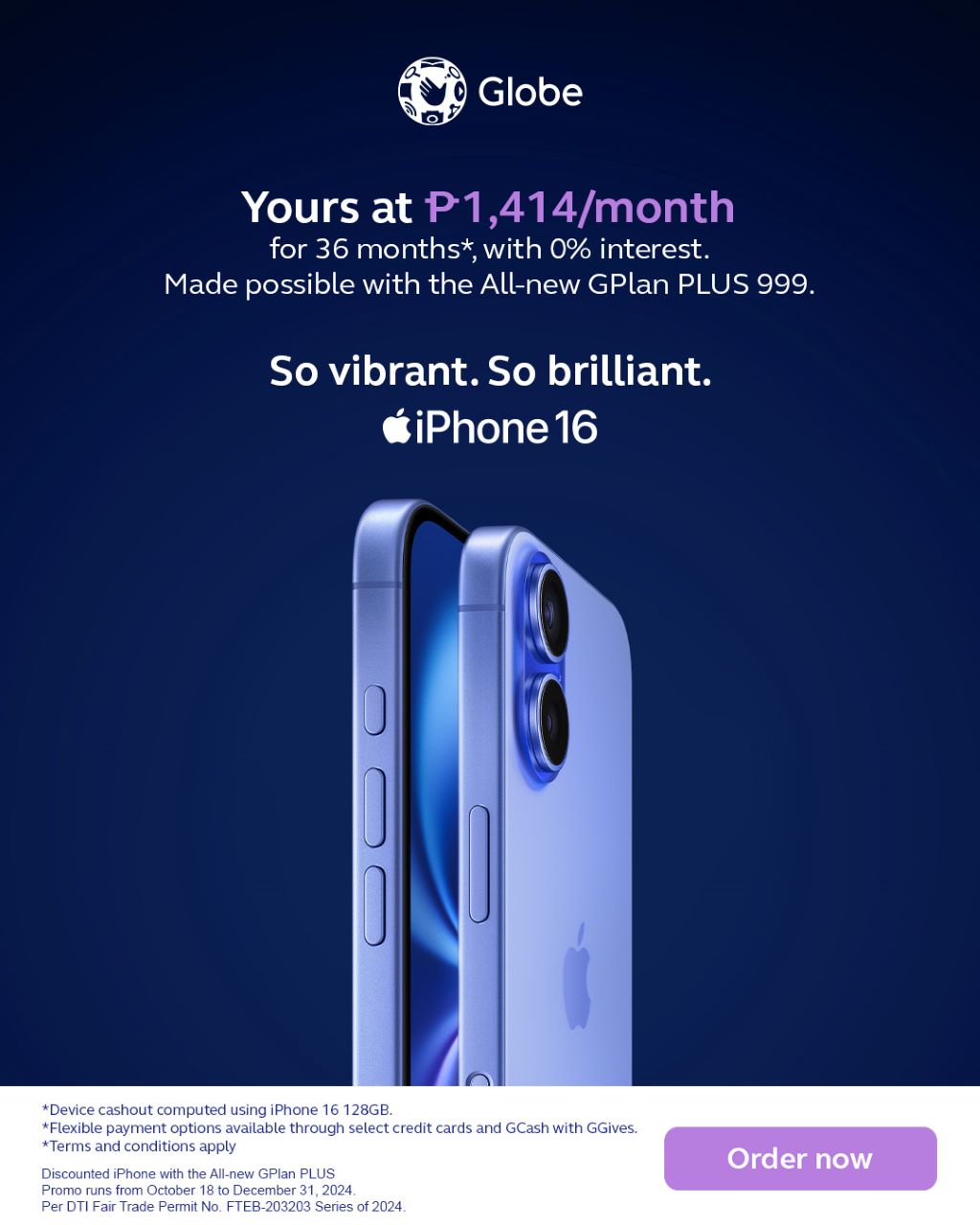 Globe Postpaid customers are not left out. All-New GPlan PLUS 999 offers the iPhone 16 at an affordable cashout of just PHP 1,414 monthly for 36 months. Available in Globe Stores nationwide, the plan is the best iPhone 16 deal in the market.