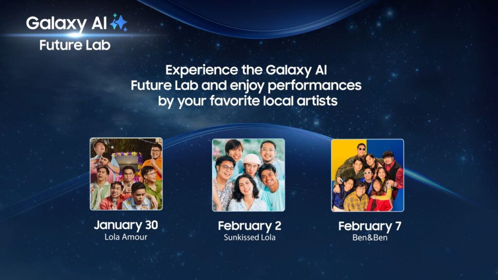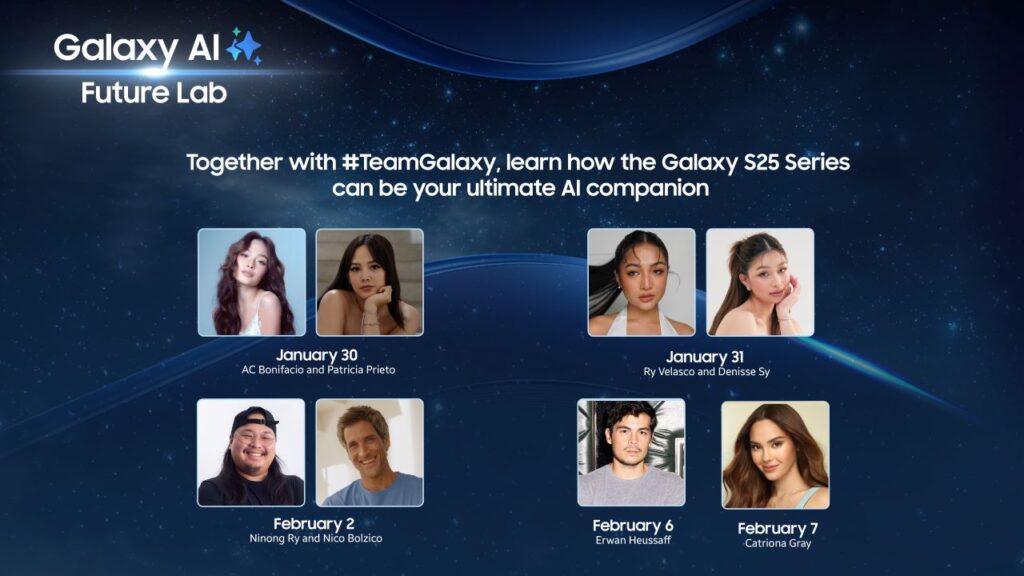 Learn new ways to boost your productivity with several workshop sessions from industry experts like Meta and Google executives or level up your content creation skills for travel or concerts with TikTok top creators. You can also hear from #TeamGalaxy members on how the Galaxy S25 series has become their true AI companion: AC Bonifacio and Patricia Prieto on January 30, Ry Velasco and Denisse Sy on January 31, Ninong Ry and Nico Bolzico on February 2, Erwan Heussaf on February 6 and Catriona Gray on February 7.