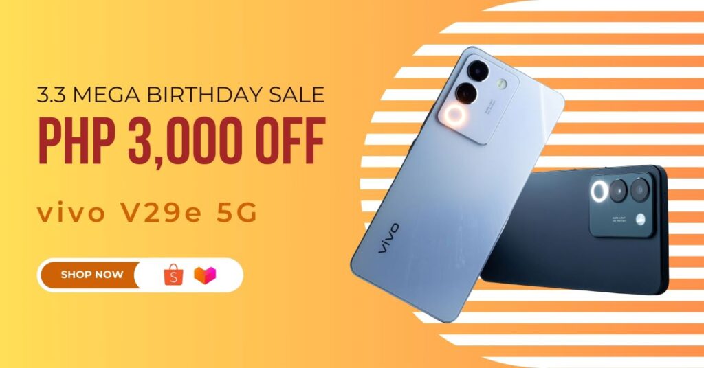 Set your notifications and get ready for surprises during the 3.3 Flash Sale on Shopee. Some exciting deals include the vivo V29e (12GB + 256GB) for only Php 14,799. You can also get the vivo V29 5G at 12GB + 256GB variant for Php 20,899 and 12GB + 512GB variant for Php 22,899.