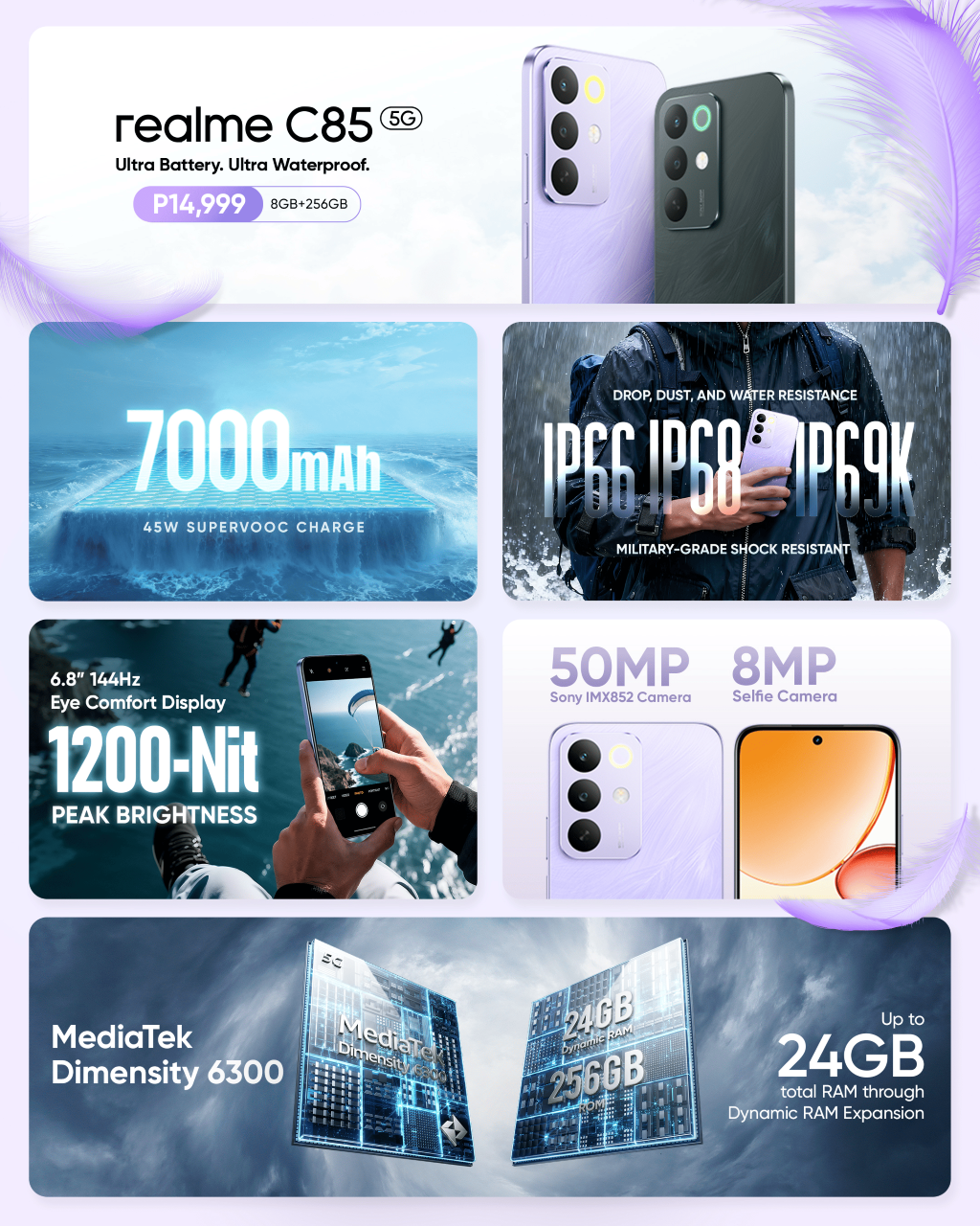 The realme C85 5G comes in two stylish Feather-Inspired colorways: Parrot Purple and Peacock Green. Alongside the 5G model, the realme C85 4G is also officially available in the Philippines, giving fans more options that fit their needs and budget.