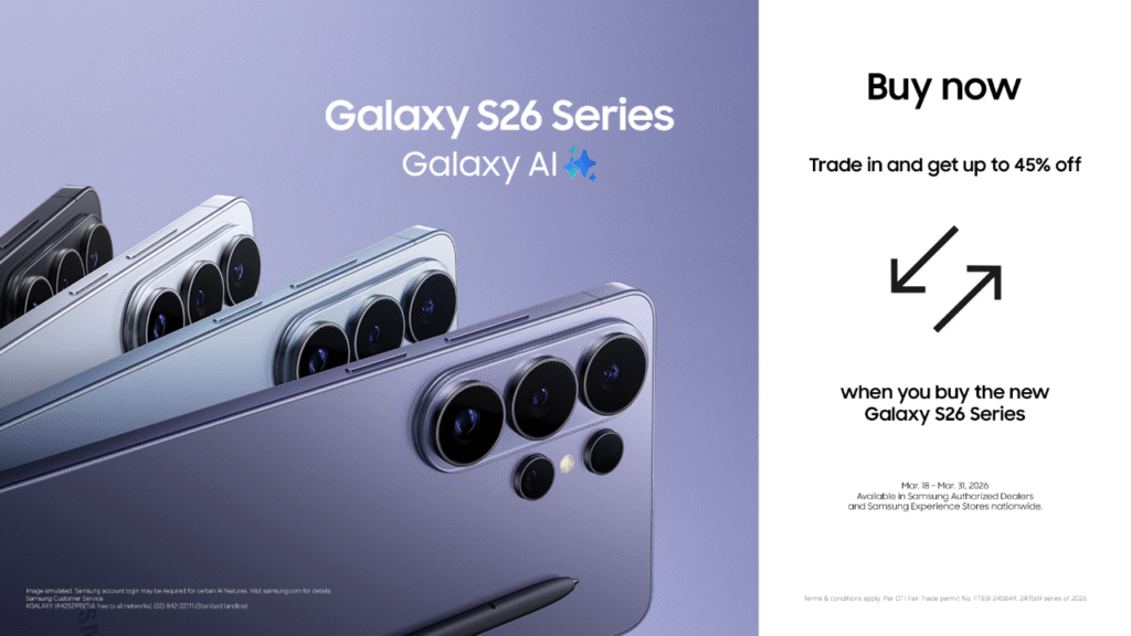 Experience the AI phone era and get 45% off on the Galaxy S26 Ultra, Galaxy S26+, and Galaxy S26 when you trade in your current phone. Get up to 12% off with 0% installment up to 36 months through Metrobank, Unionbank, BPI, BDO, EastWest, and HSBC at participating Samsung Authorized Stores nationwide. Pair the Galaxy S26 Series with Buds4 Series or Watch for extra savings up to 15% until March 31, 2026