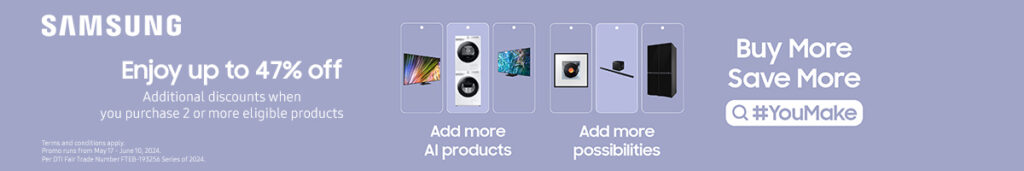 Don’t miss out on these fantastic deals of Samsung’s #YouMake the winning play until June 10, 2024. Buy more, save more! Find out more about Samsung’s #YouMake deals at https://www.samsung.com/ph/youmake/
