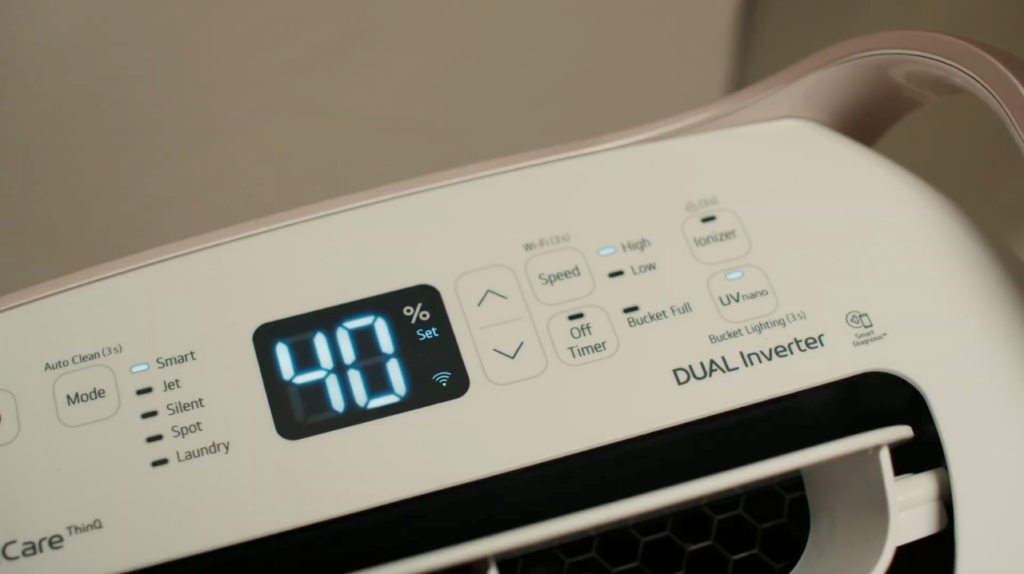 Despite its powerful performance, it runs at a whisper-quiet 34dB, making it ideal for work, rest, or sleep. Smooth-gliding wheels and an ergonomic handle allow easy mobility, while the LG ThinQ™ app enables remote monitoring and control of humidity levels and settings, anytime, anywhere.