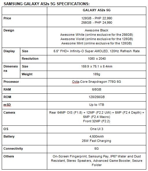 For more information about the Samsung Galaxy A52s 5G, visit samsung.com/ph.