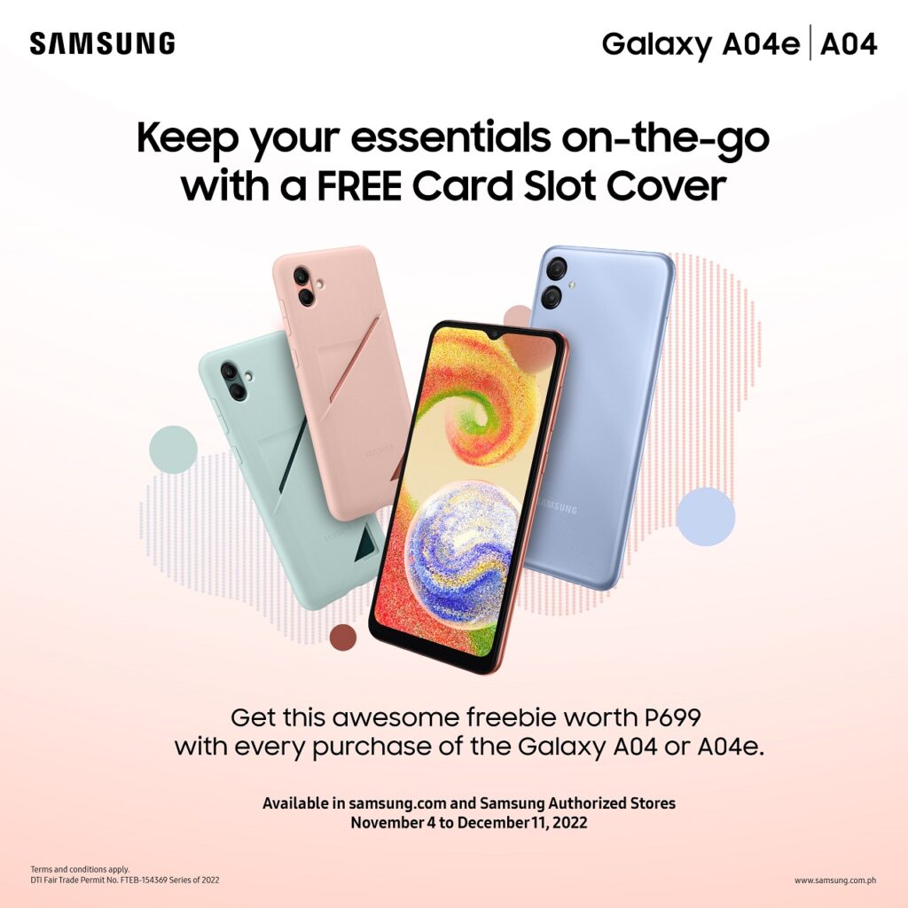 Also, until December 11, the Galaxy A04 and Galaxy A04e will come with a FREE Card Slot Cover with every purchase so you can keep your essentials with you on-the-go and make every awesome moment count.[1]