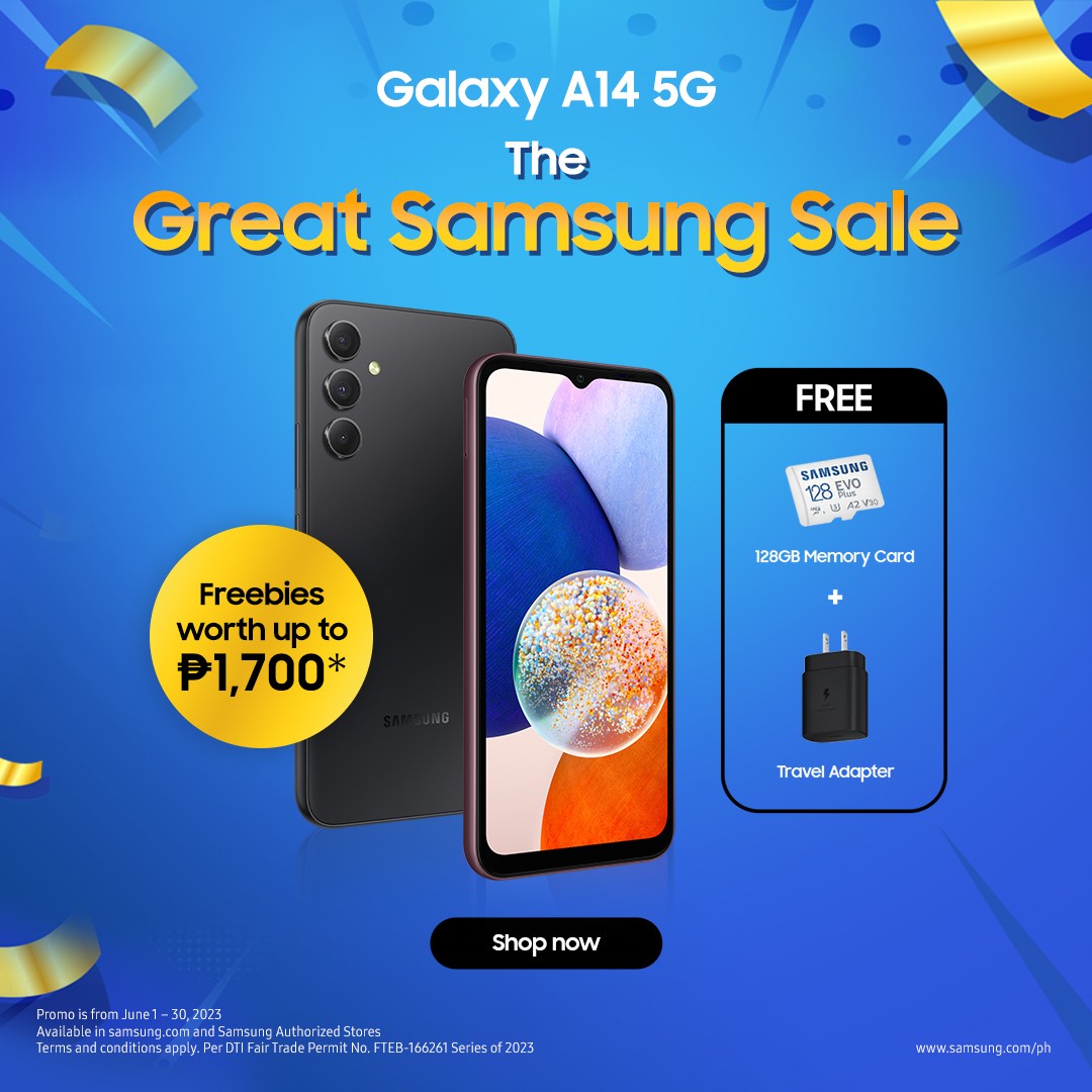 Meanwhile, the Galaxy A14 5G, which is a great starter phone, now comes with a free travel adapter and 128 GB memory card for as low as PHP 12,990. This stylish phone also comes in fresh and funky colors, and is equipped with a 50MP Main Camera and a 2-day battery for non-stop fun.