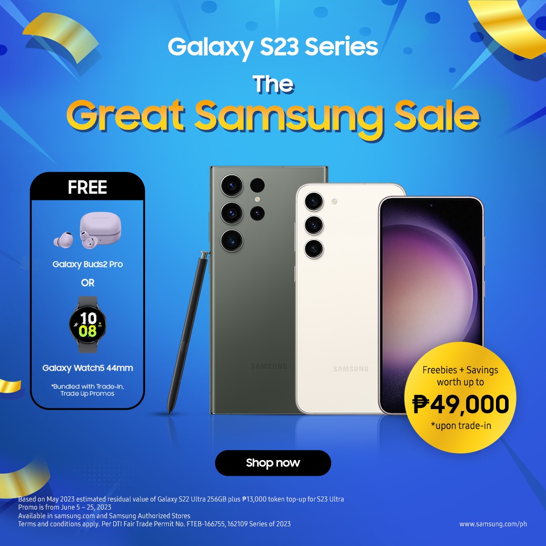 Happening from June 1 to 25, The Great Samsung Sale offers exciting freebies with a free Galaxy Buds2Pro or Galaxy Watch5 44mm, Galaxy Tab A7 Lite or Galaxy Tab A8 Wi-Fi, big discounts up to 25% and amazing trade in deals of up to PHP 15,000 off.