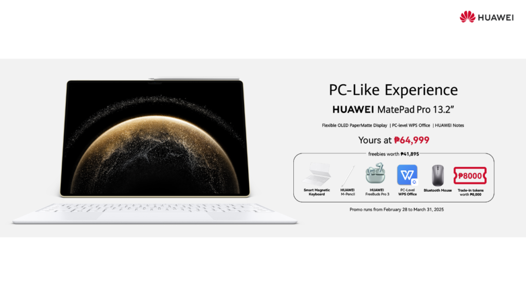 Get an exclusive bundle worth PHP 41,895 when you pre-order the HUAWEI MatePad Pro 13.2-inch 2025 today. This bundle includes a Bluetooth Mouse, Smart Magnetic Keyboard, HUAWEI 3rd Gen M-Pencil, PC-Level WPS Office, and trade-in tokens worth PHP 8,000. This exclusive offer is available from February 28 to March 6 only.