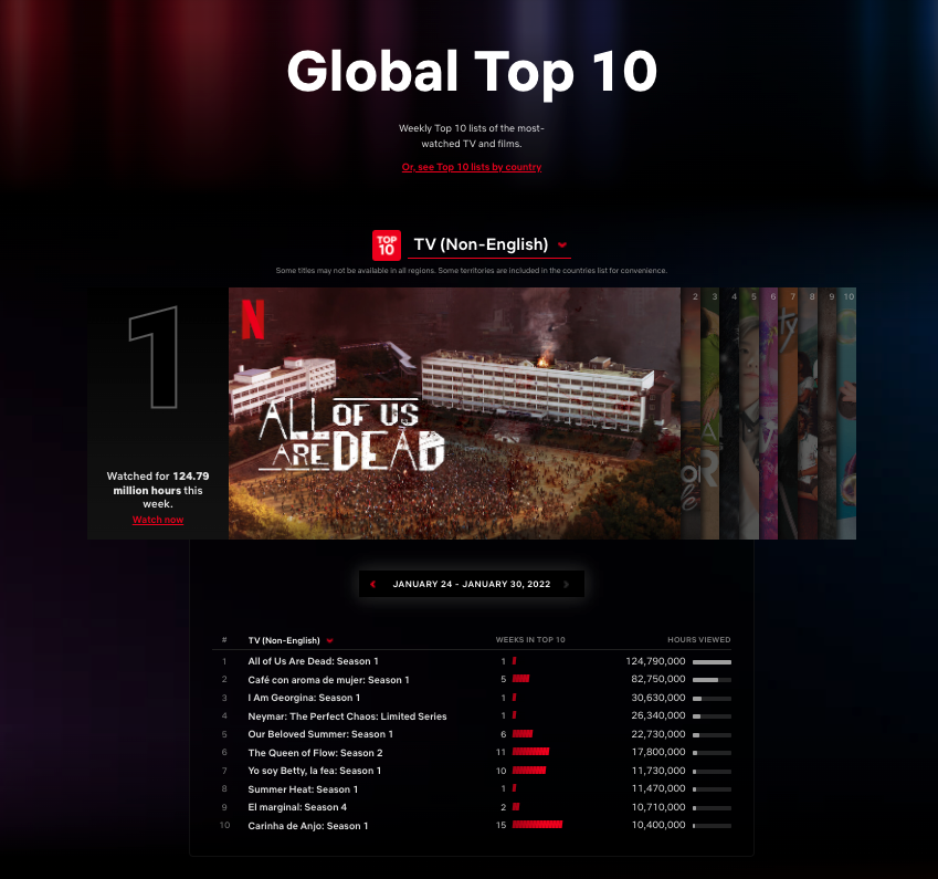 As of February 2nd (Wednesday), according to Netflix’s website www.top10.netflix.com, All of Us Are Dead recorded approximately 124.79 million hours viewed within three days of its release and seized 1st place on the TOP 10 (Non-English TV) list in a staggering 29 countries. Furthermore, the series ranked in the Top 10 among an additional 62 countries, including the USA, Canada, Brazil, Greece, Russia, Spain, Italy, etc., announcing the start of a new global phenomenon.