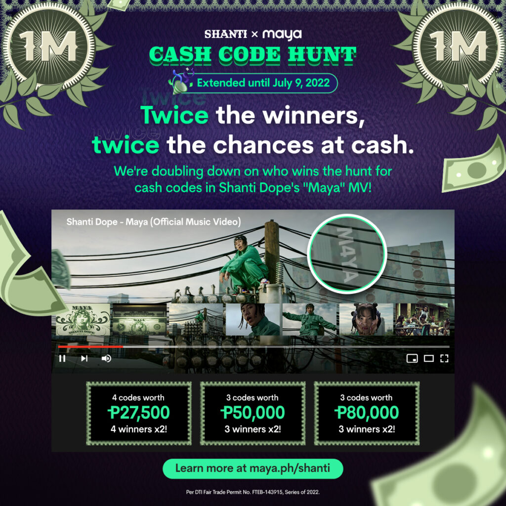 Maya is doubling down on the winners for its Maya x Shanti Cash Code Hunt, with more prizes up for grabs – all hidden in plain sight in Shanti Dope’s Maya music video. From 10 winners for a P500,000 prize pot, there are now 20 winners who can get a chance to take home a share of the P1,000,000 worth of prizes! All you have to do is find them here: Shanti Dope – Maya (Official Music Video)