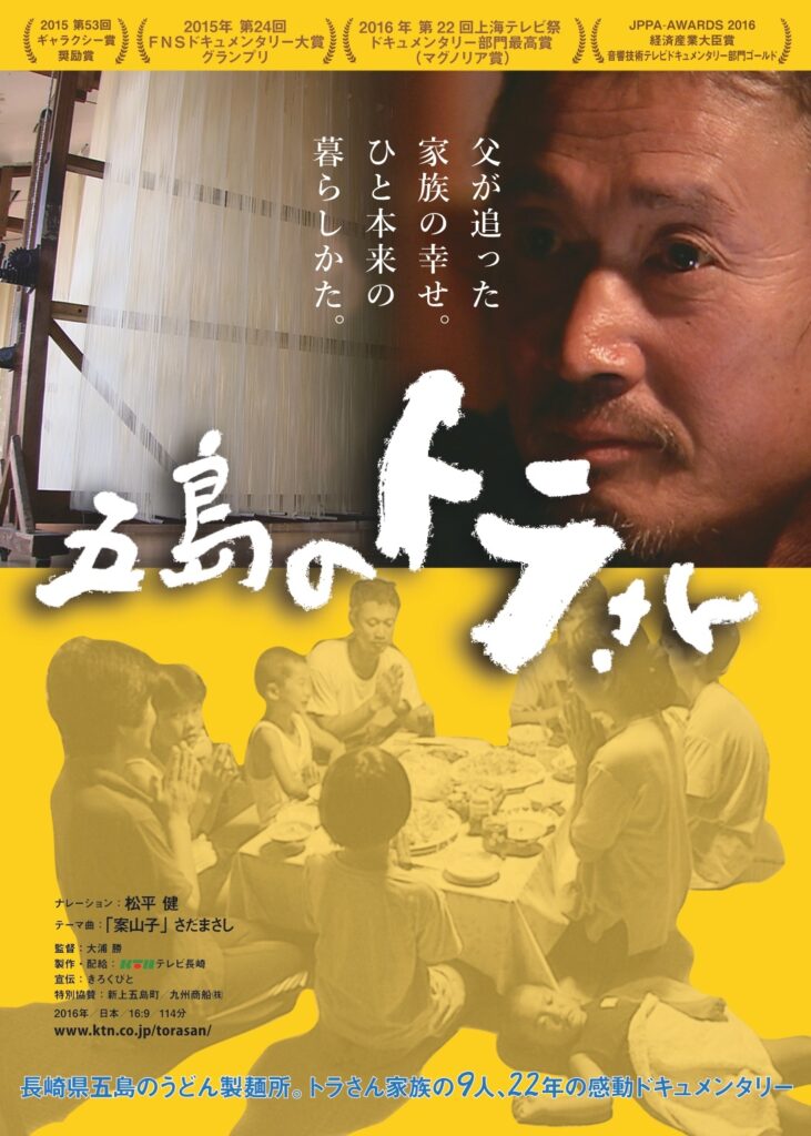A documentary shot from 1993 and over 22 years chronicled a large family who make their living as udon noodle makers on the Goto Archipelago in Nagasaki Prefecture. Inuzuka Torao, known as “Tora of Goto” runs an udon noodle making business on the Goto Archipelago. Everyday, his seven children wake up at 5am, help with the business for an hour, then head for school. Over the 22 years the documentary follows them, the children all grow up.