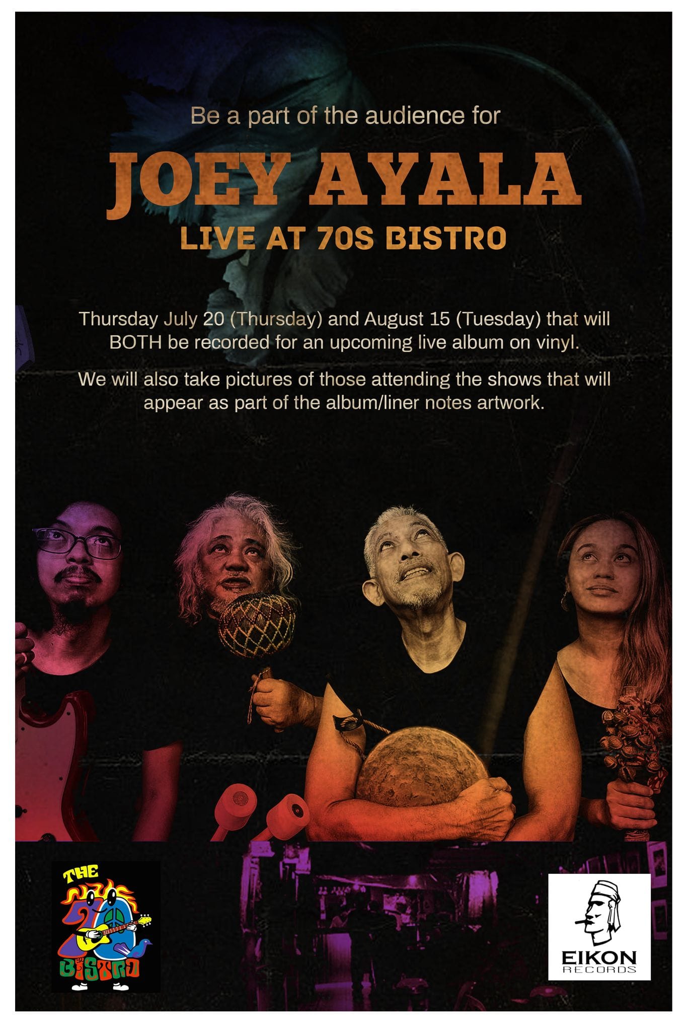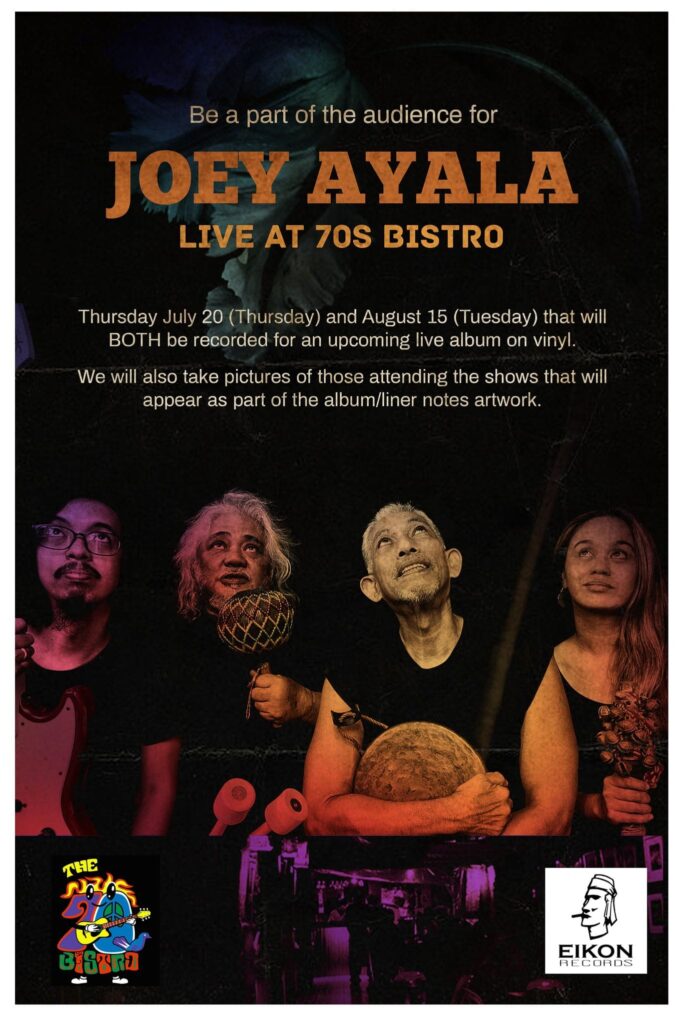 The 67 year old who was nominated to be National Artist, will be performing his greatest hits during these two nights. During his time with the press, Ayala, who is also a Palanca-award-winning writer shared how a live recording is different from recording in a studio, he compared it to water, a studio recording is like bottled water, manufactured, sterile, in a bottle, you basically know what you are going to get, but a live recording is like flowing water, free, it goes anywhere it wants to, anything can happen. When you’re performing live in front of an audience you also draw your energy from them. The audience plays more of a role in a live recording that they actually think, and the audience from the ‘Joey Ayala Live at the 70s Bistro’ show will definitely be in for a treat! Not only will they get to enjoy a night of Joey Ayala’s timeless music but their photos may be taken and they just might make it on the sleeves of the vinyl! How exciting is that! And since the show is recorded, you may actually hear yourselves, and for anyone who has been in a live Joey Ayala performance, you know he loves to have his audience sing along.