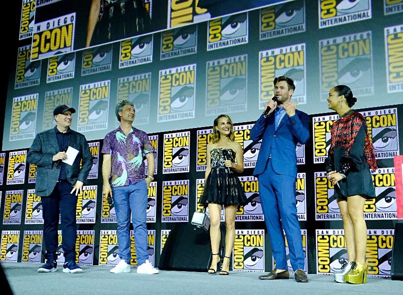 SAN DIEGO, CALIFORNIA – JULY 20: (L-R) President of Marvel Studios Kevin Feige, Director Taika Waititi, Natalie Portman, Chris Hemsworth and Tessa Thompson of Marvel Studios’ ‘Thor: Love and Thunder’ at the San Diego Comic-Con International 2019 Marvel Studios Panel in Hall H on July 20, 2019 in San Diego, California. (Photo by Alberto E. Rodriguez/Getty Images for Disney)