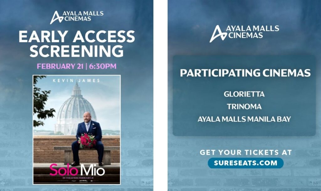 Ayala Malls Cinemas proudly presents the Early Access screening of “Solo Mio” on Saturday, February 21, at 6:30 PM, taking off at Glorietta, TriNoma, and Manila Bay, ahead of its wide release across all Ayala Malls Cinemas on February 25.