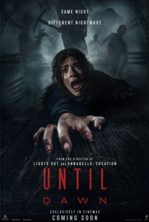 One year after her sister Melanie mysteriously disappeared, Clover and her friends head into the remote valley where she vanished in search of answers. Exploring an abandoned visitor center, they find themselves stalked by a masked killer and horrifically murdered one by one… only to wake up and find themselves back at the beginning of the same evening. Trapped in the valley, they’re forced to relive the night again and again – only each time the killer threat is different, each more terrifying than the last. Hope dwindling, the group soon realizes they have a limited number of deaths left, and the only way to escape is to survive until dawn. “Until Dawn” is directed by David F. Sandberg, and stars Ella Rubin, Michael Cimino, Odessa A’zion, Ji-young Yoo, Belmont Cameli, Maia Mitchell, and Peter Stormare. Based on the Playstation Studios video game.
