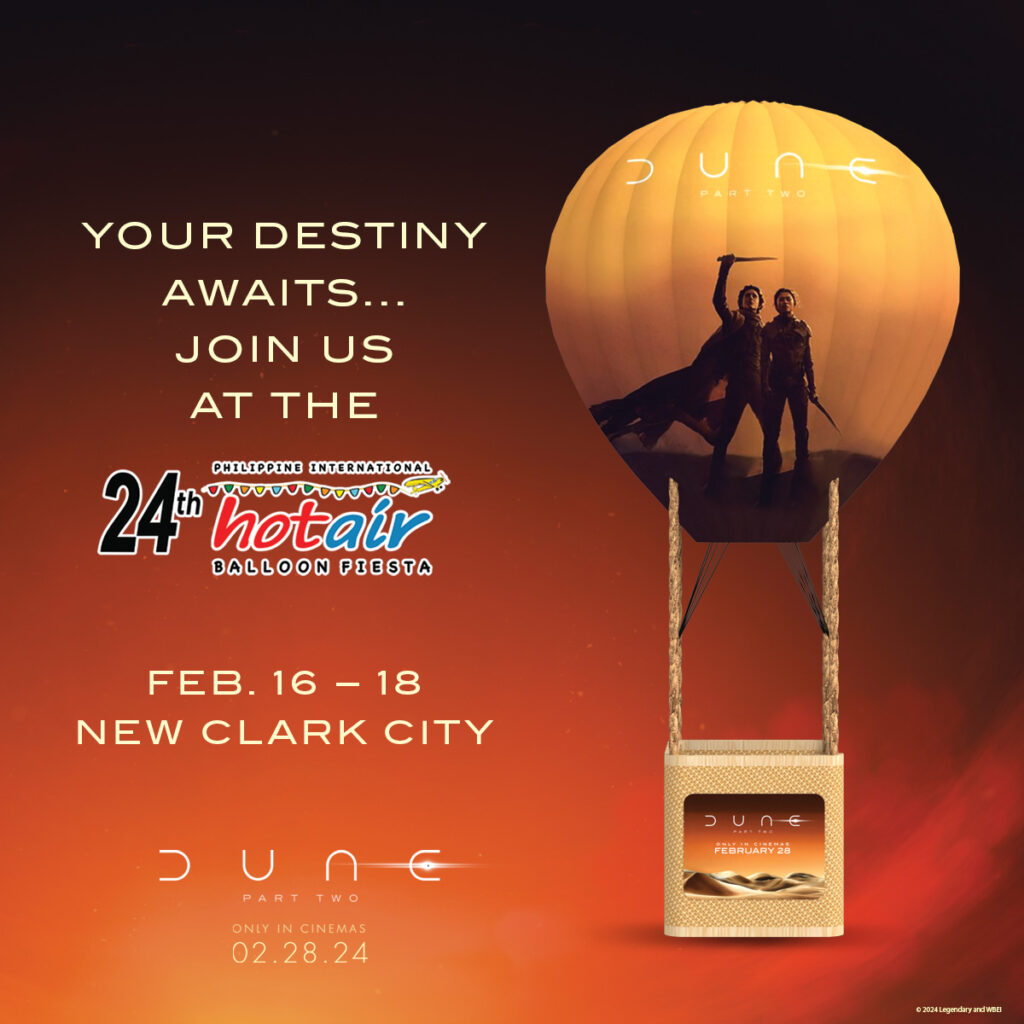 Love is in the air, along with a spectacle of hot air balloons, at the 24th Philippine International Hot Air Balloon Fiesta in New Clark City, Tarlac. Joining the festivities in anticipation of the big-screen epic adventure of the year., Dune: Part Two will have a hot air balloon booth. Guests can have their photos taken, and take home Dune: Part Two premium souvenir items.