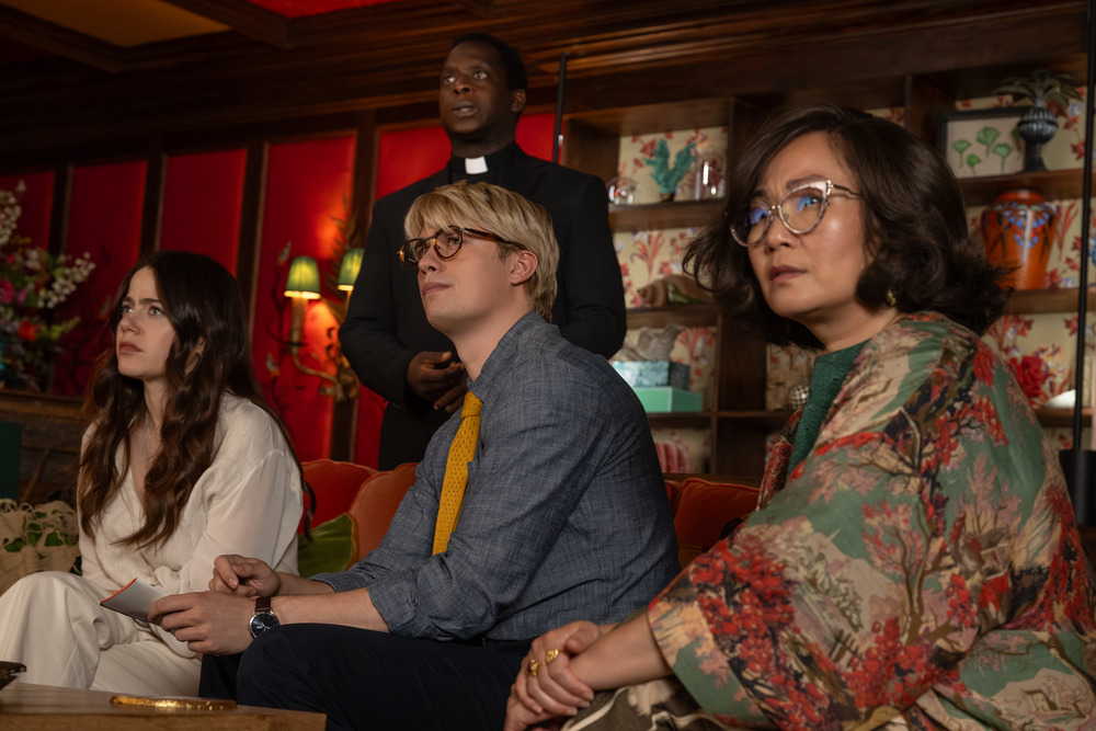 No one expected Rebecca Hampstead, played by Molly Gordon, to arrive in Denbrook, as the people in town didn’t even know she existed. George never disclosed to anyone that he had a daughter, and this immediately makes her suspicious to the people, and the sheep. “Rebecca was a delicious challenge,” says Gordon. “She’s set up as a suspect from her entrance,which gave me so many fun opportunities to toy with the audience’s expectations and interpretations. I spent a lot of time thinking about how certain looks or movements could be read. I’d never done a mystery before, let alone one where I’m the prime suspect, so I had so much fun getting to play.”