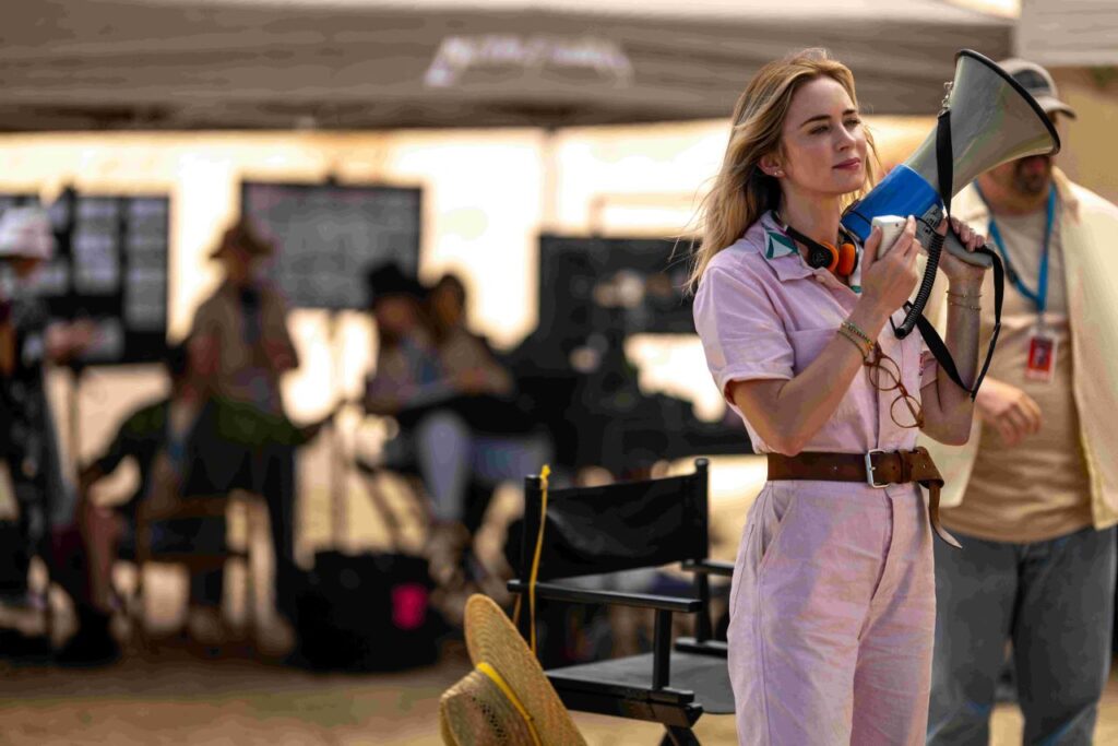 Blunt had a blast exploring the world of making action movies from the inside. “Here we show the juxtaposition of the spectacle and the reality of making movies, which is beautiful. It’s absurd and wonderful at the same time,” said Blunt. “And there is another layer of tension that comes with action films, like setting up these stunts for hours to then drop someone off a building.”