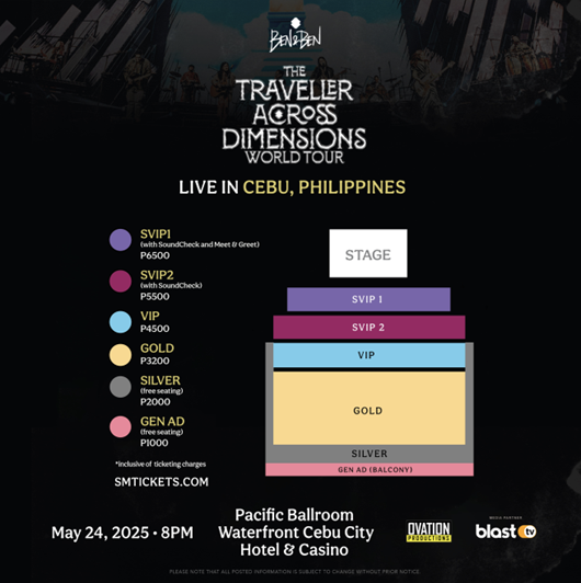 Tickets are already available for the May 24 show at the Waterfront Cebu City Hotel & Casino, with announcements for the June 8 show at the University of St. La Salle in Bacolod and the June 22 performance at the SMX Convention Center in Davao to come in the next few weeks.