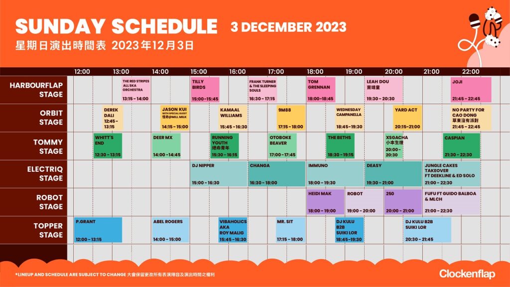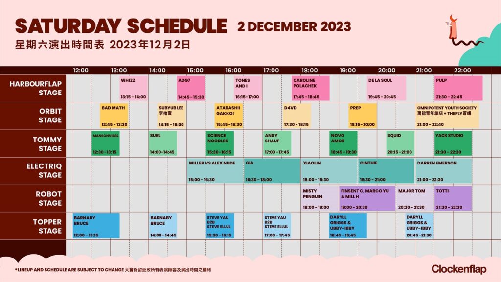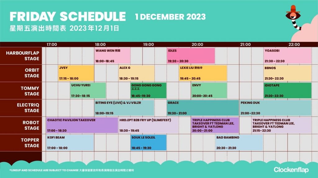 [Hong Kong, November 8, 2023] Clockenflap, Hong Kong’s biggest international outdoor music and arts festival, has announced its full lineup and schedule for its upcoming edition, which takes place at Central Harbourfront from Friday 1 to Sunday 3 December 2023. Three-day weekend tickets and Friday single-day tickets for the festival have already sold out, but Saturday and Sunday single-day tickets are still available to buy.