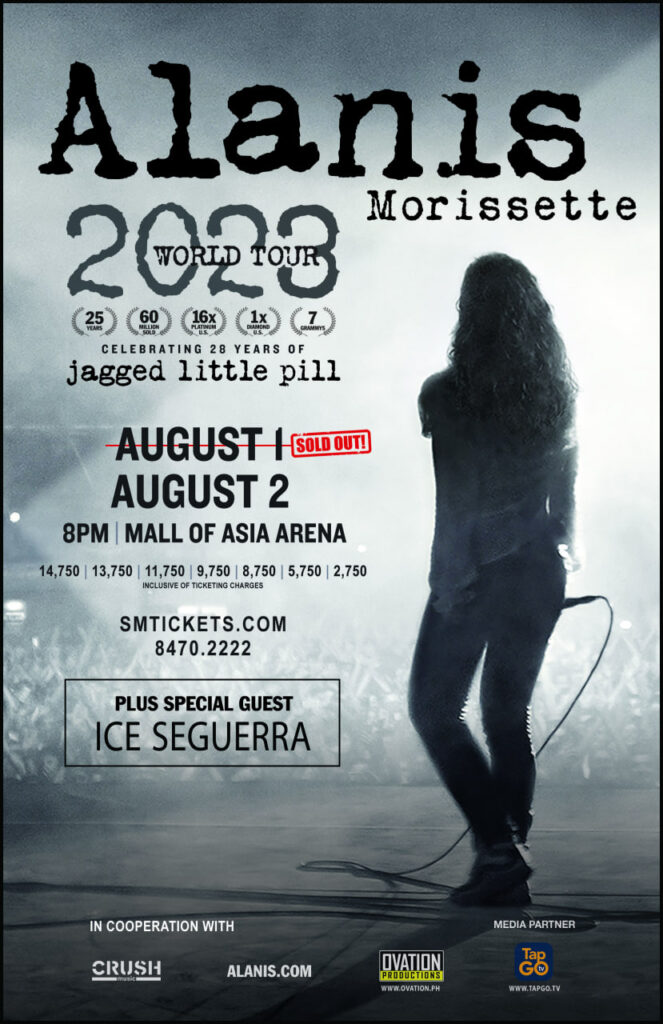 On March 21, 2023, Ovation Productions announced the Philippine concerts of Alanis Morissette on August 1 and 2, 2023, at the Mall of Asia Arena. This highly anticipated event is the celebration of the Anniversary tour of Morissette’s Jagged Little Pill, which was postponed twice or thrice due to COVID. Appearing as the front act is Ice Seguerra.