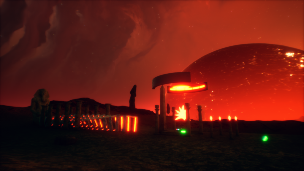 Set amongst red sands, this world is littered with runes and artifacts of a once-powerful society. Undiscovered constellations and celestial bodies move across the sky above you as you explore, illuminating new secrets to discover.