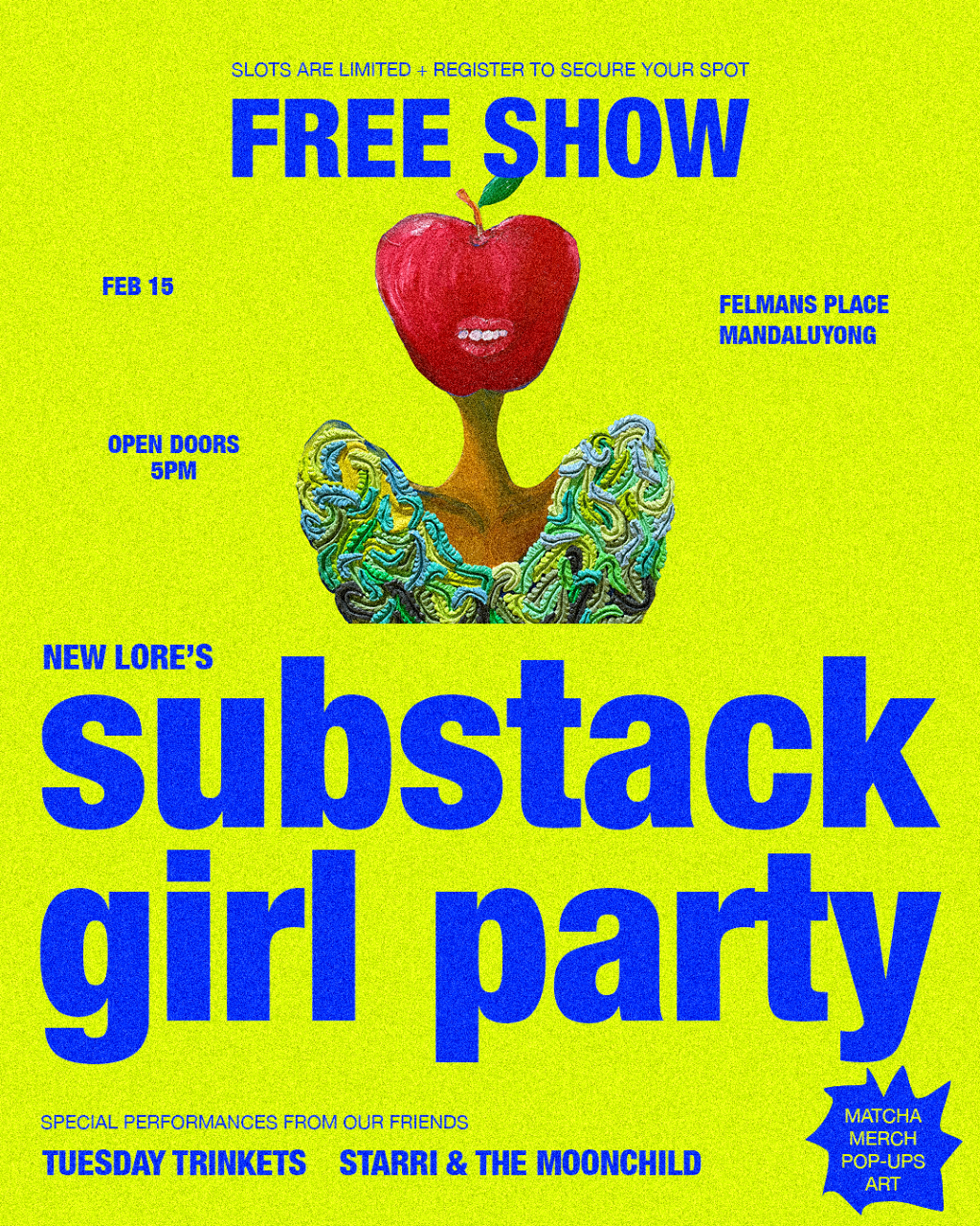 They are holding a FREE SHOW on Feb 15, 2026 at Felmans Place in Mandaluyong with front acts tuesday trinkets and Starri & The Moonchild. Register here to secure your spot! bit.ly/substackgirlparty