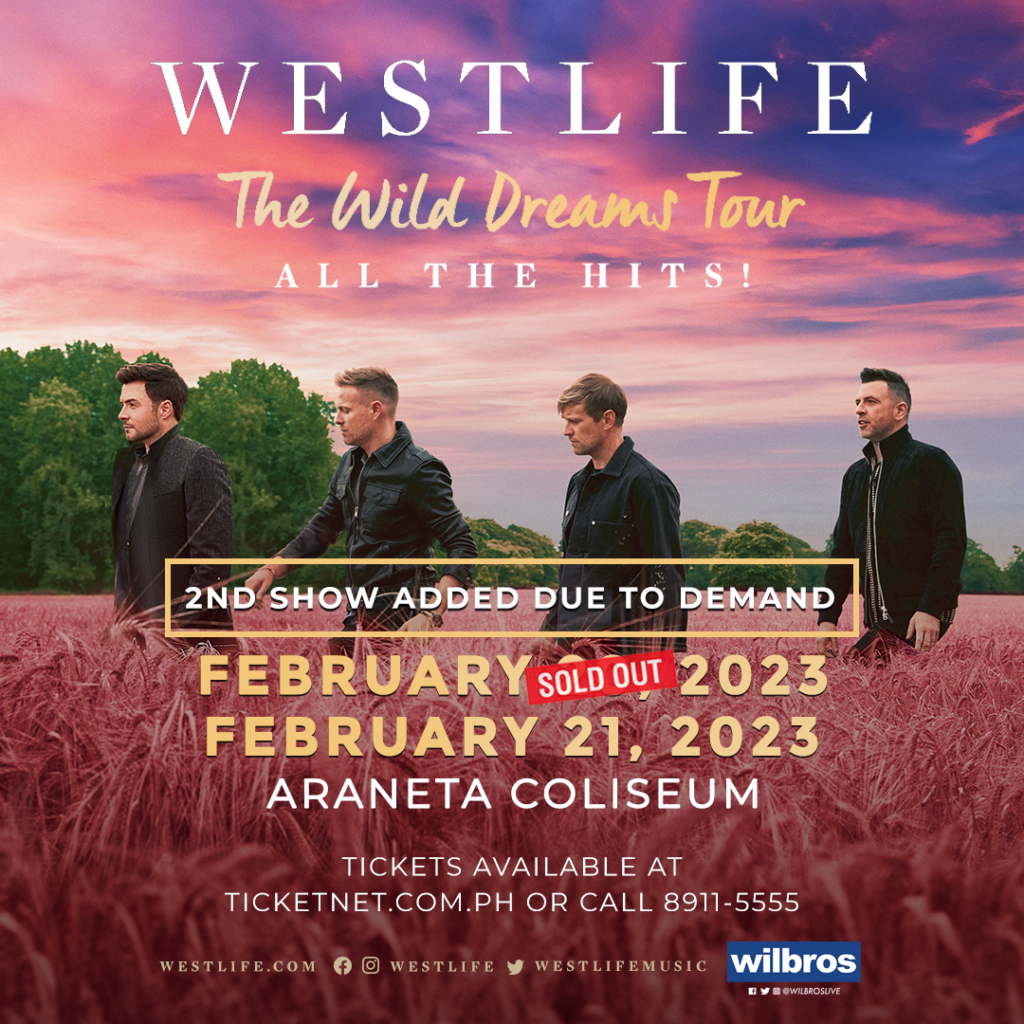 Fans are excited for WESTLIFE’s coming back and upcoming tour ‘The Wild Dreams Tour’ in Manila. Tickets to the February 20 show immediately sold out, as announced by concert promoter Wilbros Live. Due to public demand, the band will be adding another show on February 21, 2023 at the Araneta Coliseum.