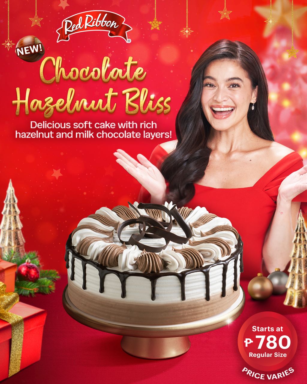Celebrate with the new Red Ribbon Chocolate Hazelnut Bliss Cake, available for only ₱780 Price Varies. Visit your nearest Red Ribbon store or order through order.redribbon.ph, GrabFood, or foodpanda.