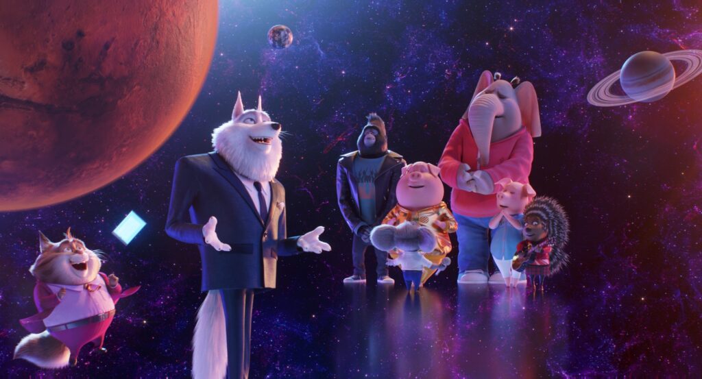 Sing 2 raises the bar in terms of their big production’s set pieces. I couldn’t stop gasping at how beautiful everything was, and even the costumes! Check out Mina’s gorgeous white dress in her big number. I don’t think I’ve seen texture that moves like that in animated movies, ever.
