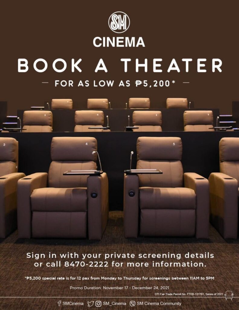 Moviegoers can also book an entire theater for a change! Get your own exclusive movie space with the current movies you like! SM Cinema is feeling good to bring you “Book- a-Theater”, reserve an exclusive cinema perfect for a private movie screening by treating your family and friends to a truly movie theatre experience.