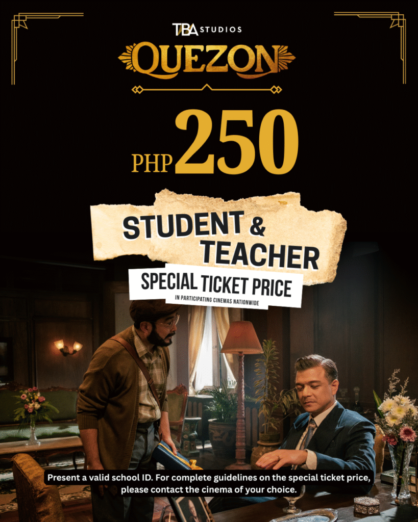 TBA Studios has officially announced that “Quezon” movie tickets will be available to students and teachers for only Php 250. To avail of the special rate, students and teachers simply need to present a valid school ID at ticket counters in participating cinemas nationwide.