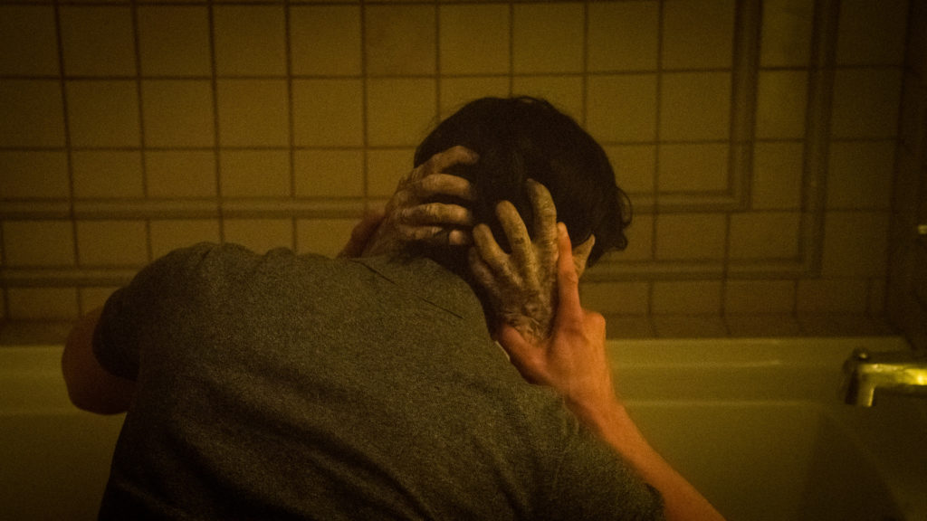 Here, Pesce also wanted the ghosts to croak, based on how they die. “But always knowing that it should be in the same world as the classic croak (which the director actually borrowed from the original film for a brief moment in the opening, when Kayako appears behind Fiona while she’s still in Japan). “Sam’s is like a traditional Grudge croak – he fell down the stairs and his neck is twisted. It’s a little bit more gurgly, because of the blood that’s pooling in his mouth. Fiona had stabbed herself in the neck, so hers is a throaty groan, but a little wheezy, because her vocal chords and her throat are punctured. And Melinda is more like a little girl shriek. So we mixed that with the sound of screams underwater. Because a child screaming is terrifying.”