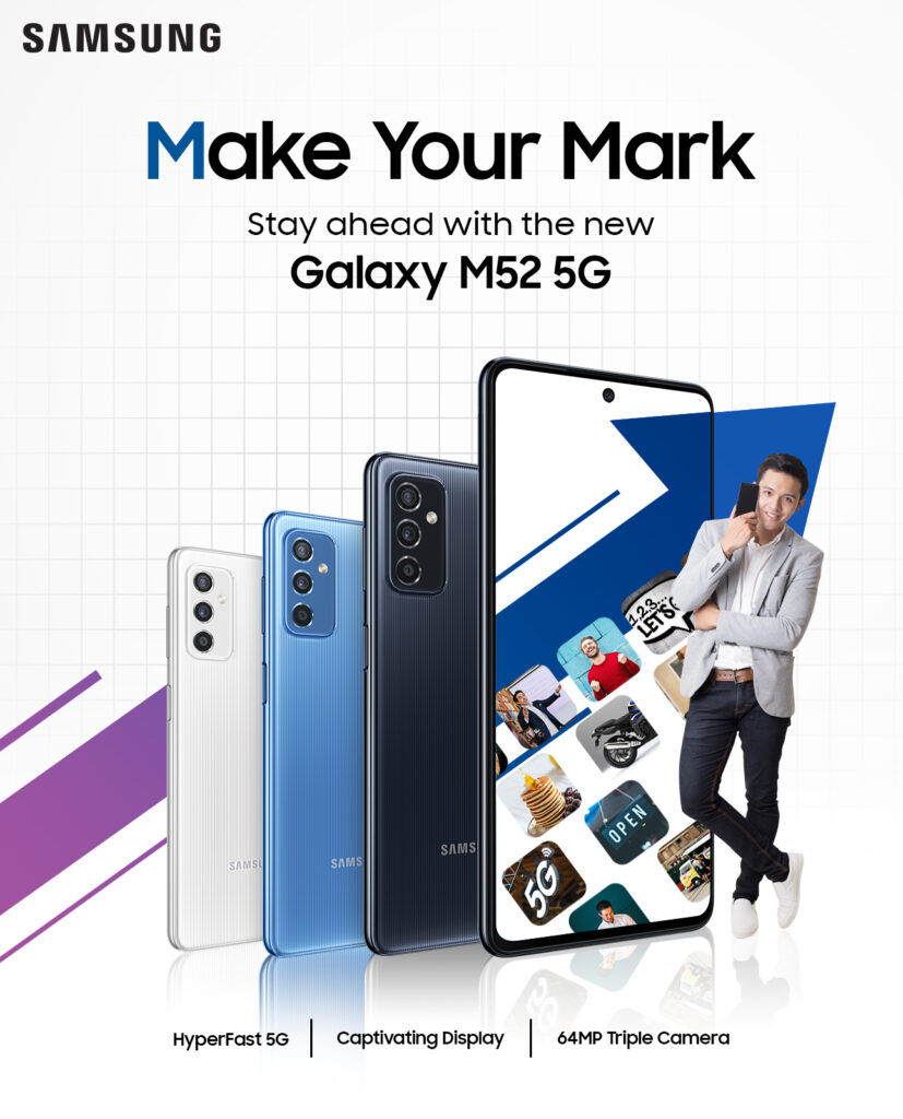Achieve great success and stay ahead of the grind with the Galaxy M52 5G, exclusively available online at Samsung.com/PH, Lazada, Shopee, Abenson.com, and MemoXpress Online, for only PHP 22,990 SRP in White, Light Blue, and Black.