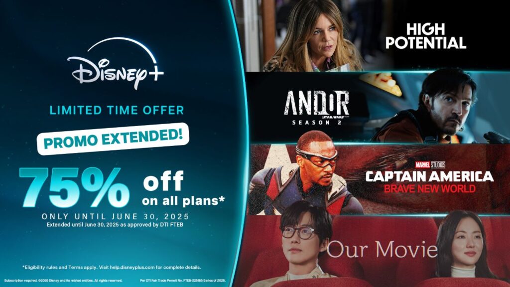 MANILA, Philippines. (June 27, 2025) – For a limited time only, all Disney+ plans are at 75% off for its Filipino subscribers! Initially with a promo duration of June 3-26, the limited time offer has been extended until June 30, 2025, allowing more Filipinos access to global blockbusters, trending KDramas, Hollywood favorites, and iconic hits from Disney, Pixar, Marvel, and Star Wars.