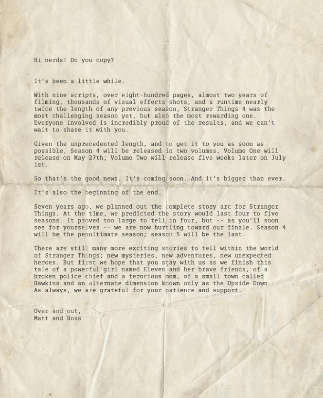 Stranger Things 4 is coming! In an open letter to fans, series creators the Duffer Brothers revealed when new episodes will debut on Netflix, and more news about the future of the worldwide hit.