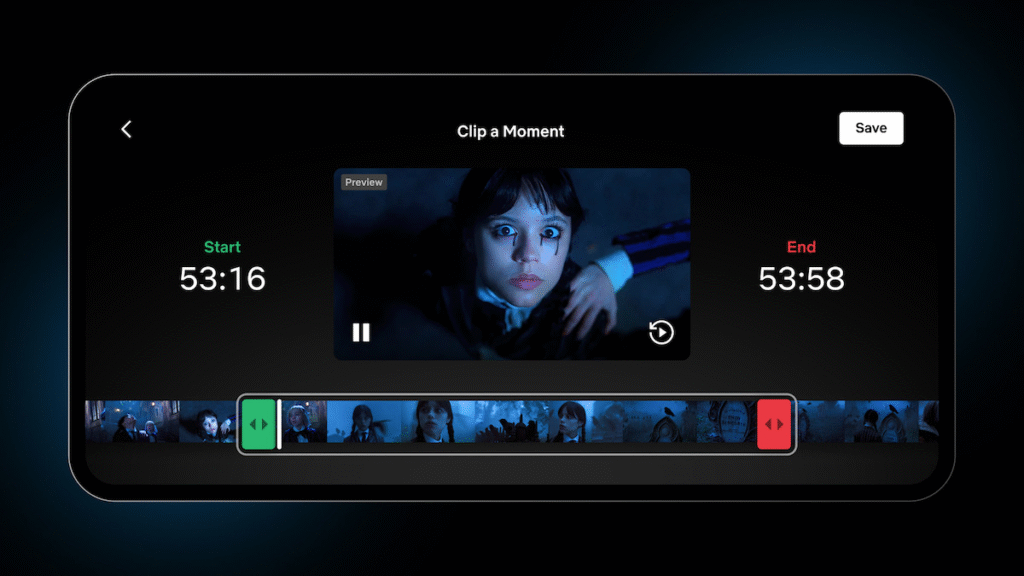 Today, alongside the release of Wednesday Season 2, Part 2, Netflix is rolling out an update that lets you set both a starting point and an end point when saving a scene — so you can turn your favorites into full clips to save, relive, and share anytime.