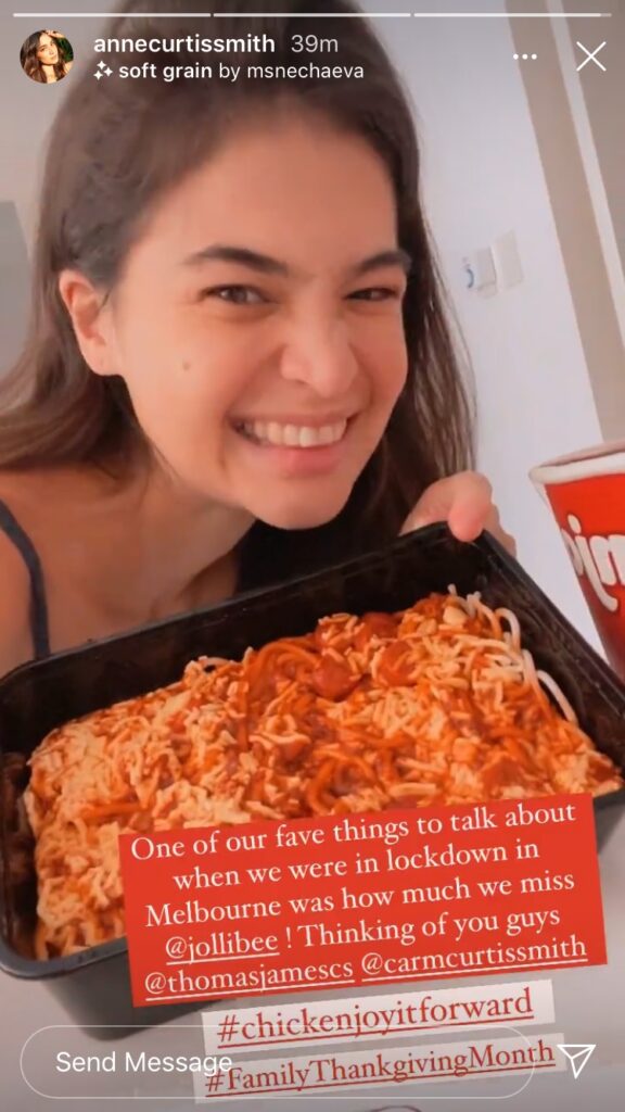 Jollibee’s Family Ambassador Anne Curtis said in her Instagram story that one of the things she and her family in Australia like to talk about was how they miss Jollibee. Now that she’s enjoying their favorite Chickenjoy and Jolly Spaghetti, it made her miss her mom and brother even more.