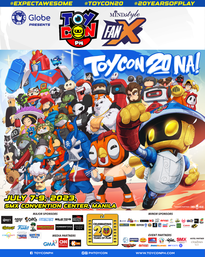 The 20th TOYCON Philippines and MINDstyle FanXperience is presented by Globe, in partnership with Great Toys Online, Filbars, Hobbiestock, CalicoToys, Gaming Library, Funtastik, Talent High, Solid Toys, Collectors Base, Stormy Vault, Devil Toys, the College of St. Benilde, Bostik, Cybercraft PH, Grimalkin, JoyToy, Gnarly, and supported by Canon, GMA Store, Quiccs, Toku Spirits, Funko Funatic Philippines, Big Boys Toy Store, Image World, Yori, Warner Brothers Pictures, Paramount Pictures, Del Monte Potato Crisp, with hotel partners, Citadines and Heritage Hotel. Also powered by Exlink Events, Anime Alliance, Ambox Events, Komiket, IPMS, the Philippine Toy Group Association and Creon Chknhead.