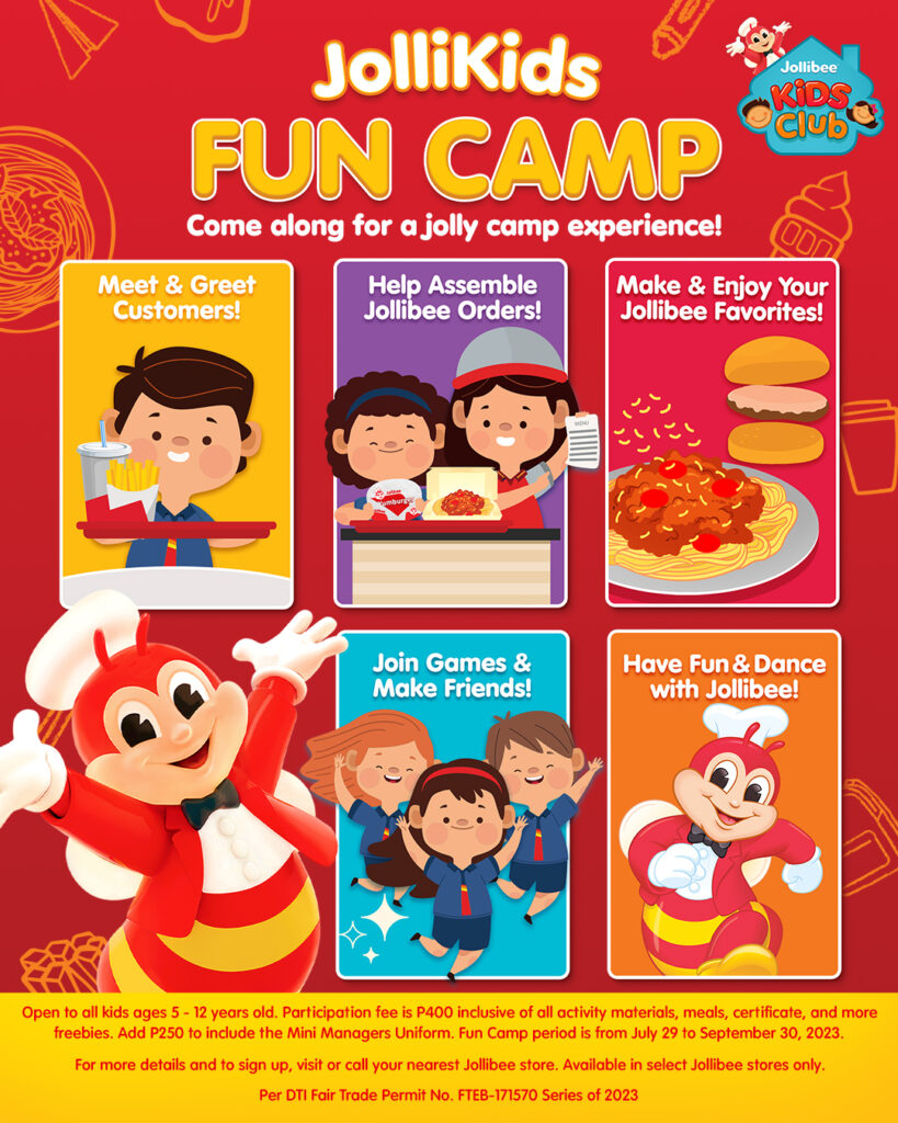 Ready for your kids to have the JolliKids Fun Camp experience? Head to select Jollibee stores starting July 29 to apply and join. To see the list of participating stores, visit this link: www.jollibee.com.ph/JollikidsFunCamp.