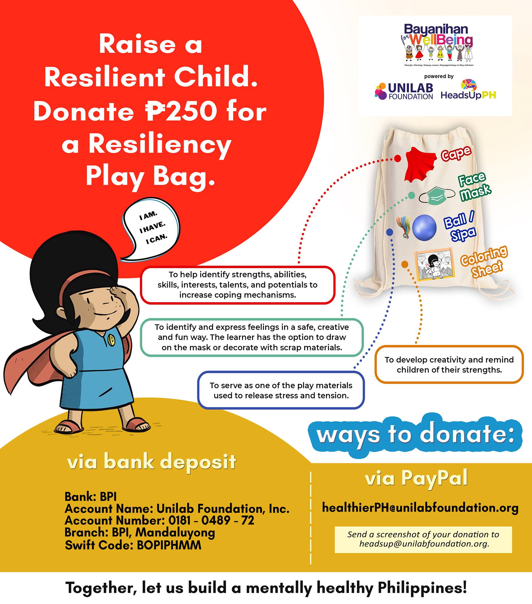 You can also support the event by donating a Bayanihan for WellBeing Resiliency Play Bag, which is composed of: (1) Toys like sipa and kickball, which are intended to help children release tension; (2) Cape and mask which they could design, allowing them to identify their strengths and make them feel like Superheroes; and (3) Writing and coloring sheets to encourage their creativity and help them express their emotions.